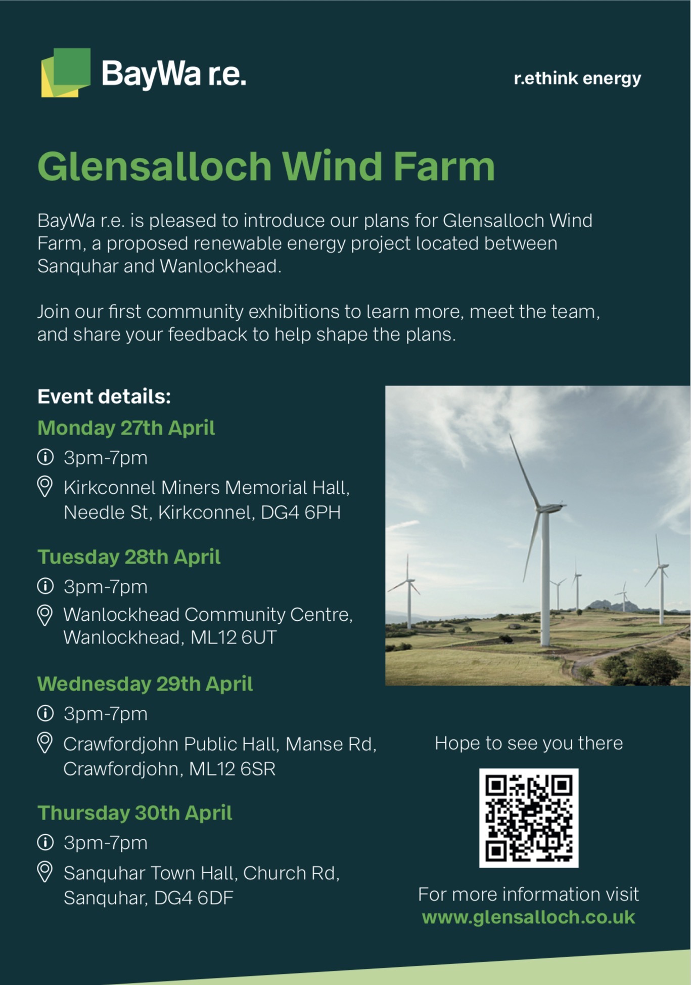 BayWa r.e. are presenting Community Exhibitions with Wanlockhead's being on Tuesday 28th April • 3pm-7pm at Wanlockhead Community Centre, Wanlockhead, ML12 6UT